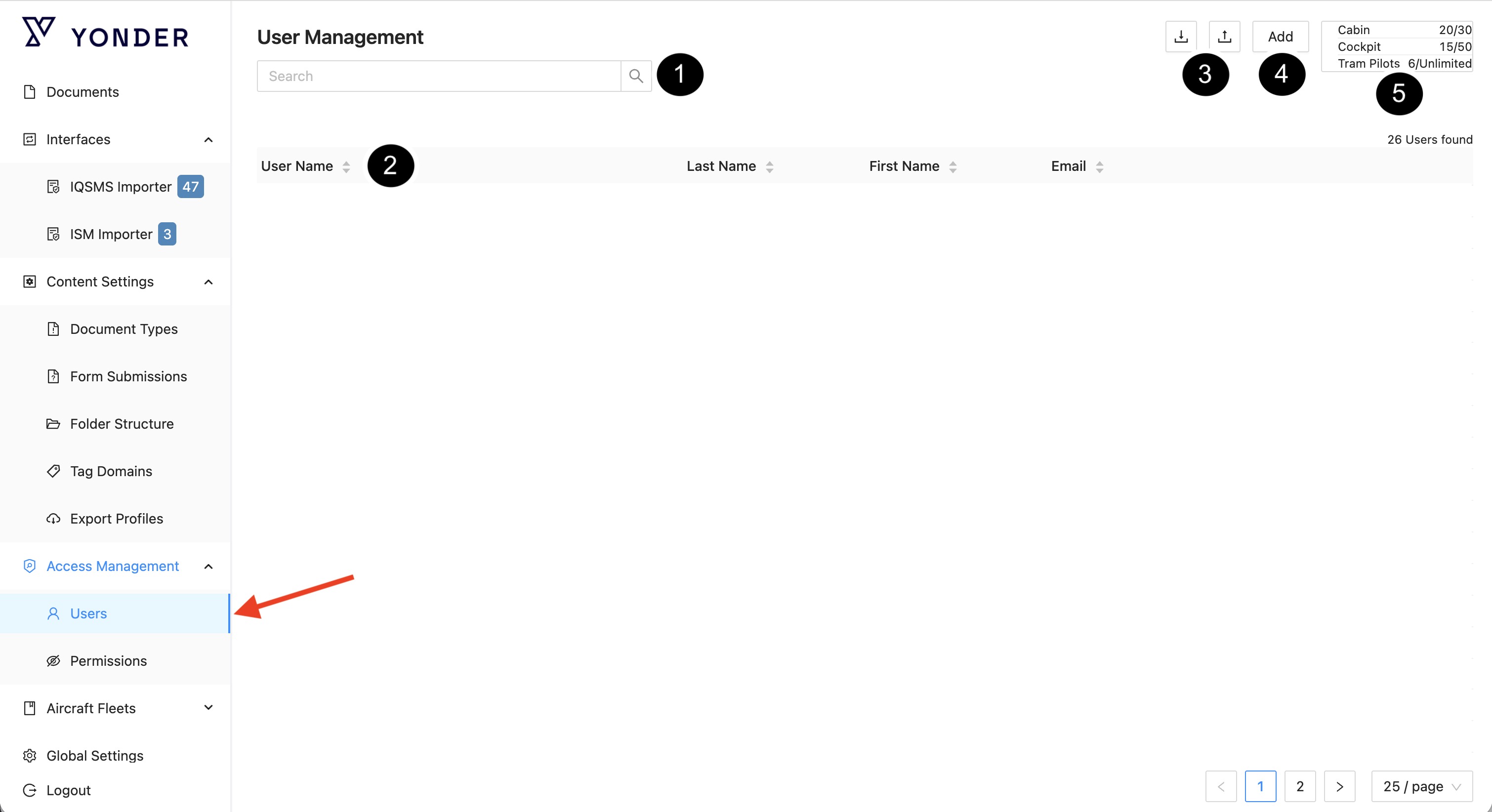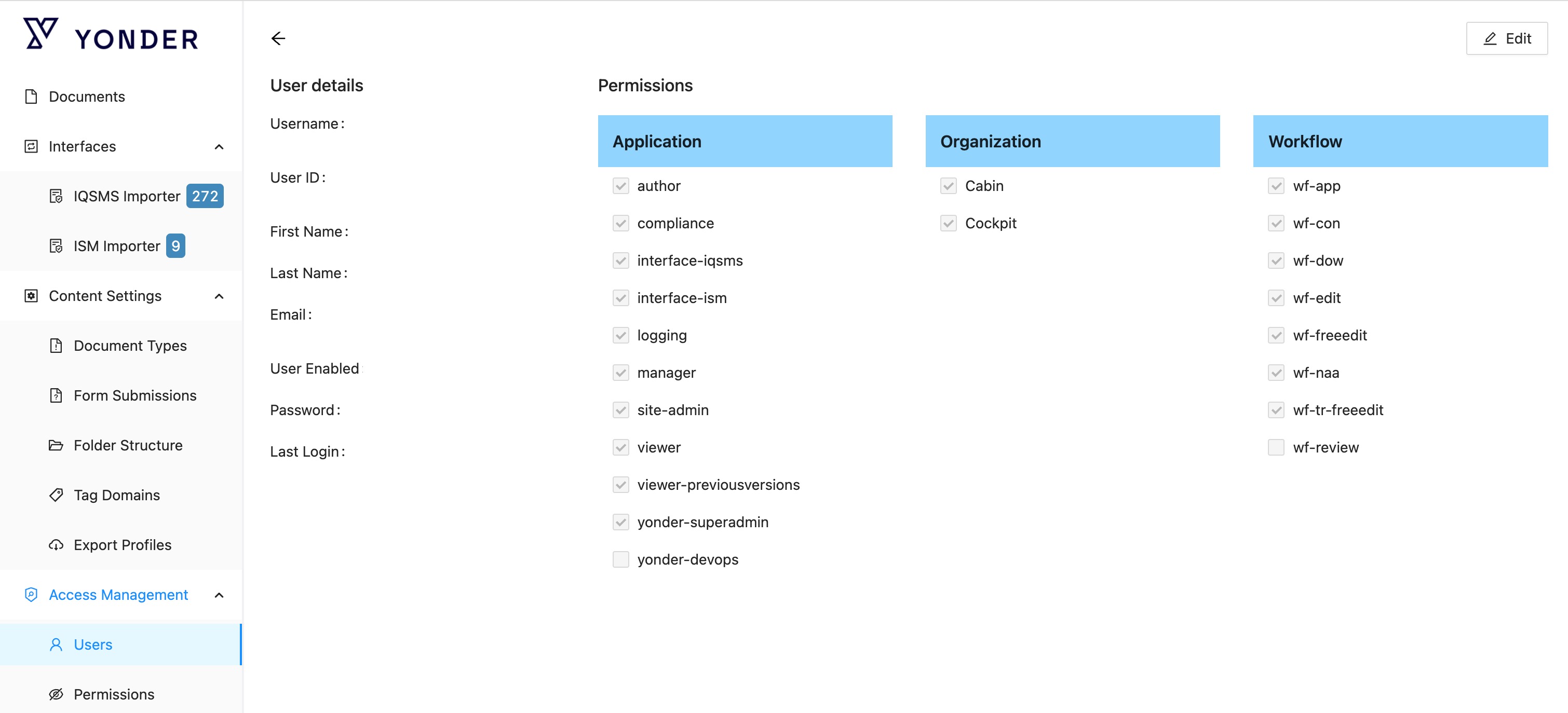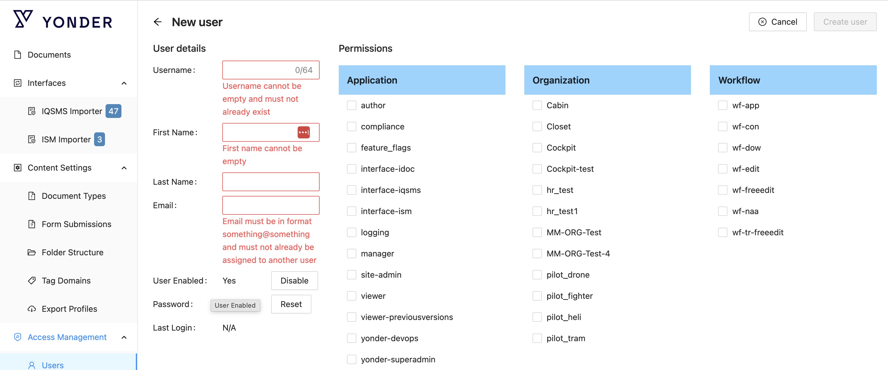 This functionality of the Yonder Admin Interface allows selected users to view and / or edit and create new users and to assign the respective user permissions. This feature may or may not be activated in your organization’s Yonder setup depending on the commercial setup.