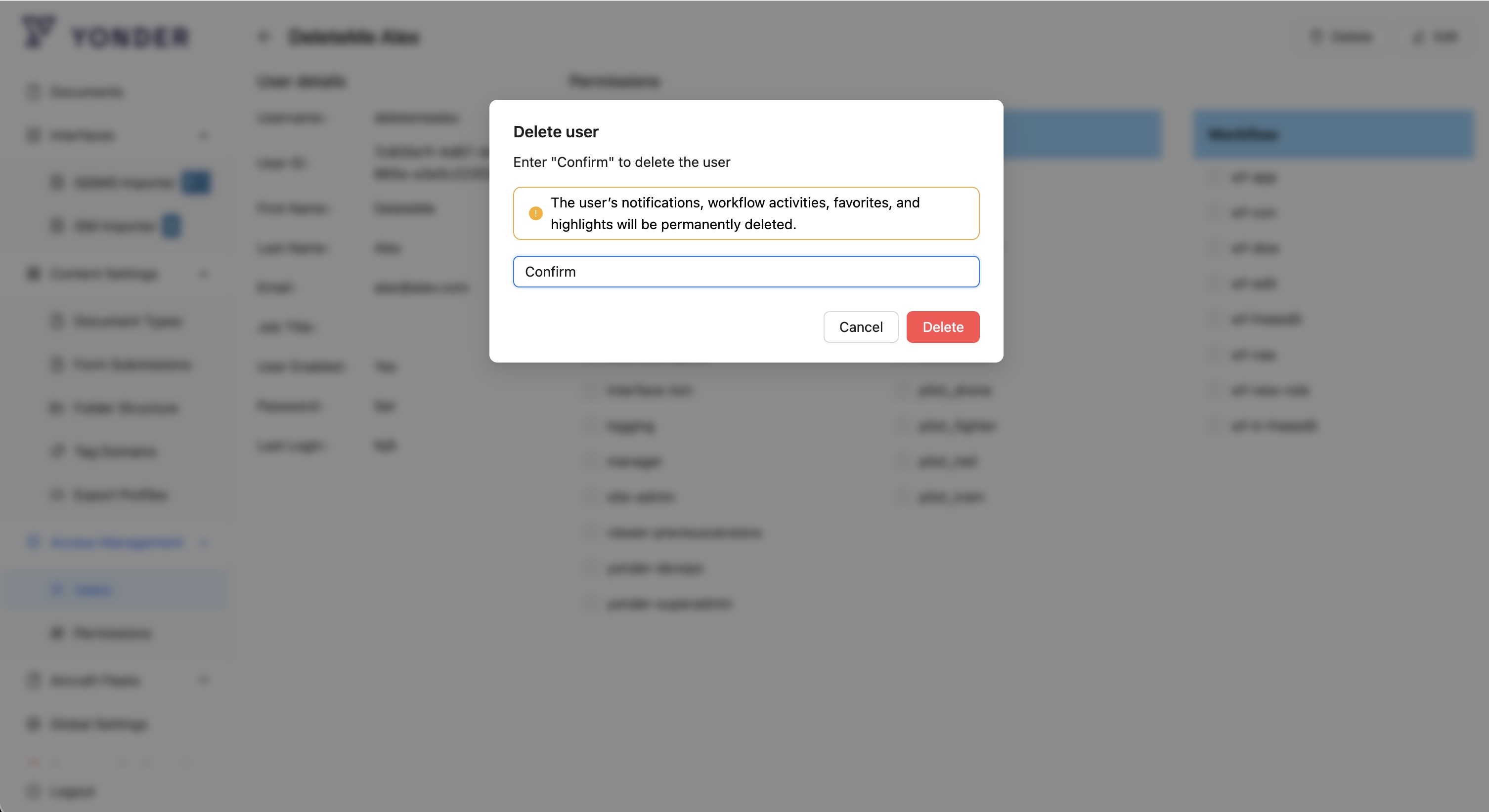 - The administrator deleting the user is informed via a popup/modal that these objects will be removed.