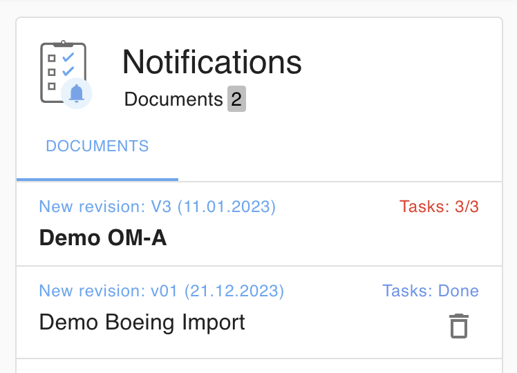 Notifications related to a document revision are always always grouped in the Notification Center. In the example below, there are three changes to a document relevant for the particular user, indicated by the number of tasks shown (= Tasks 3/3).