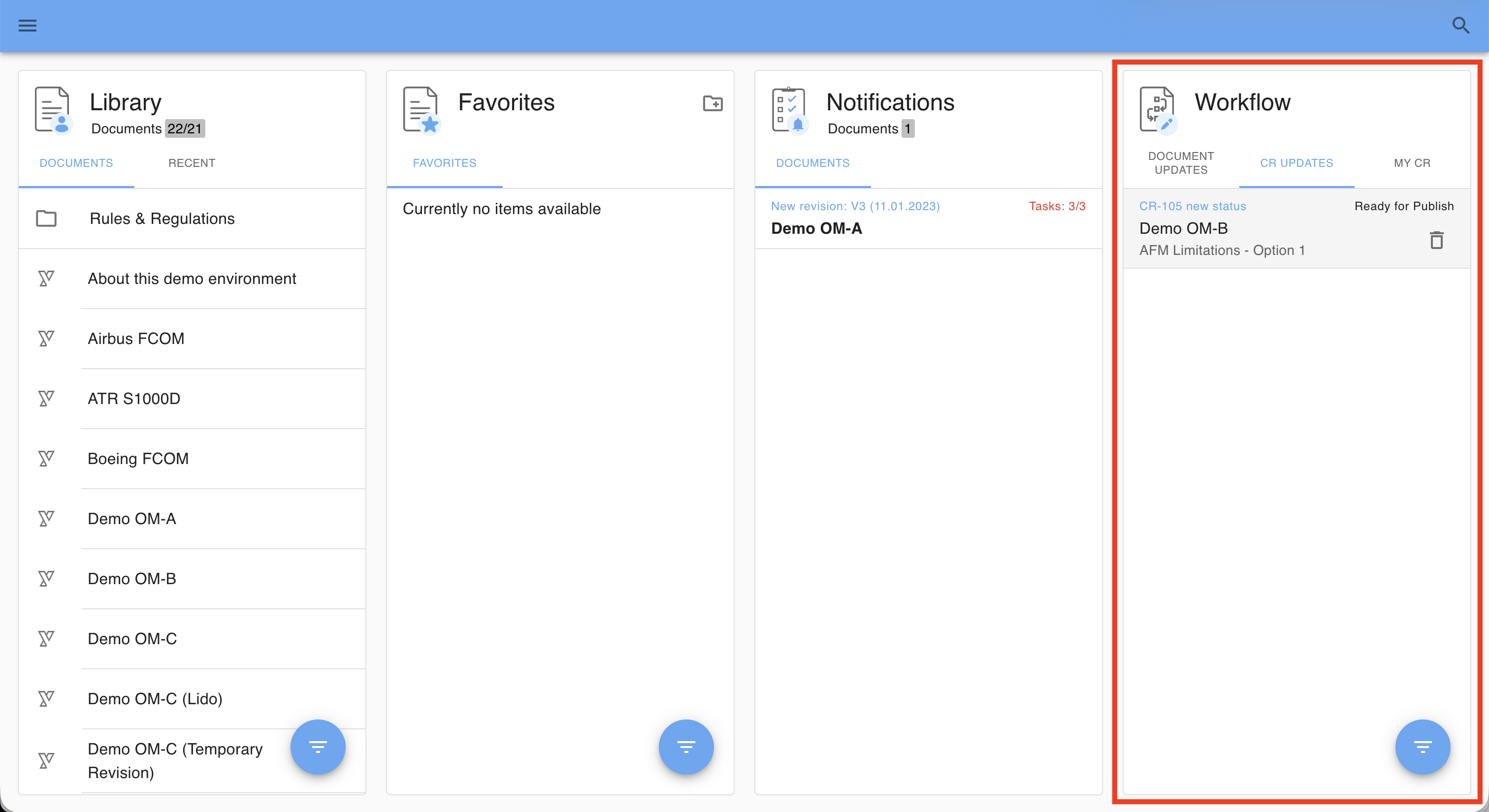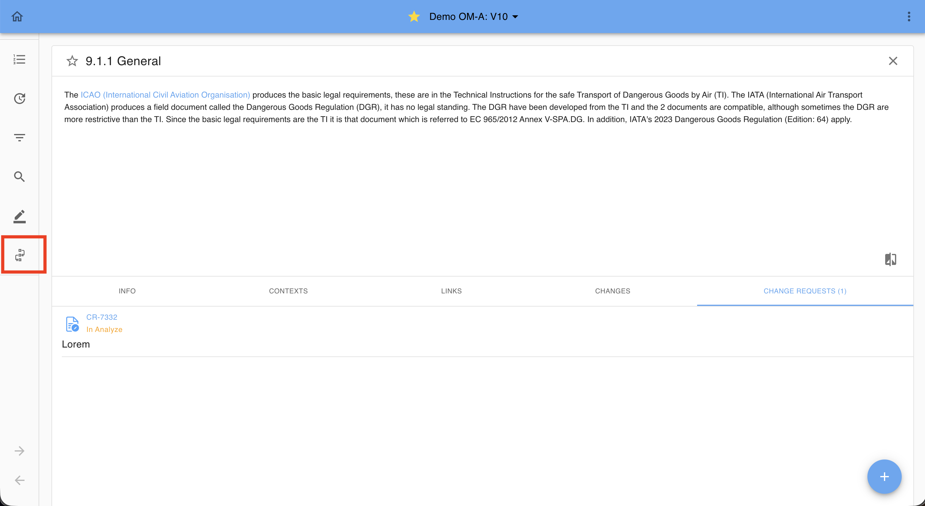 Only users with the corresponding permissions can incorporate proposed change requests. Change Requests can be accessed via notifications or directly form a document by clicking on the workflow icon: