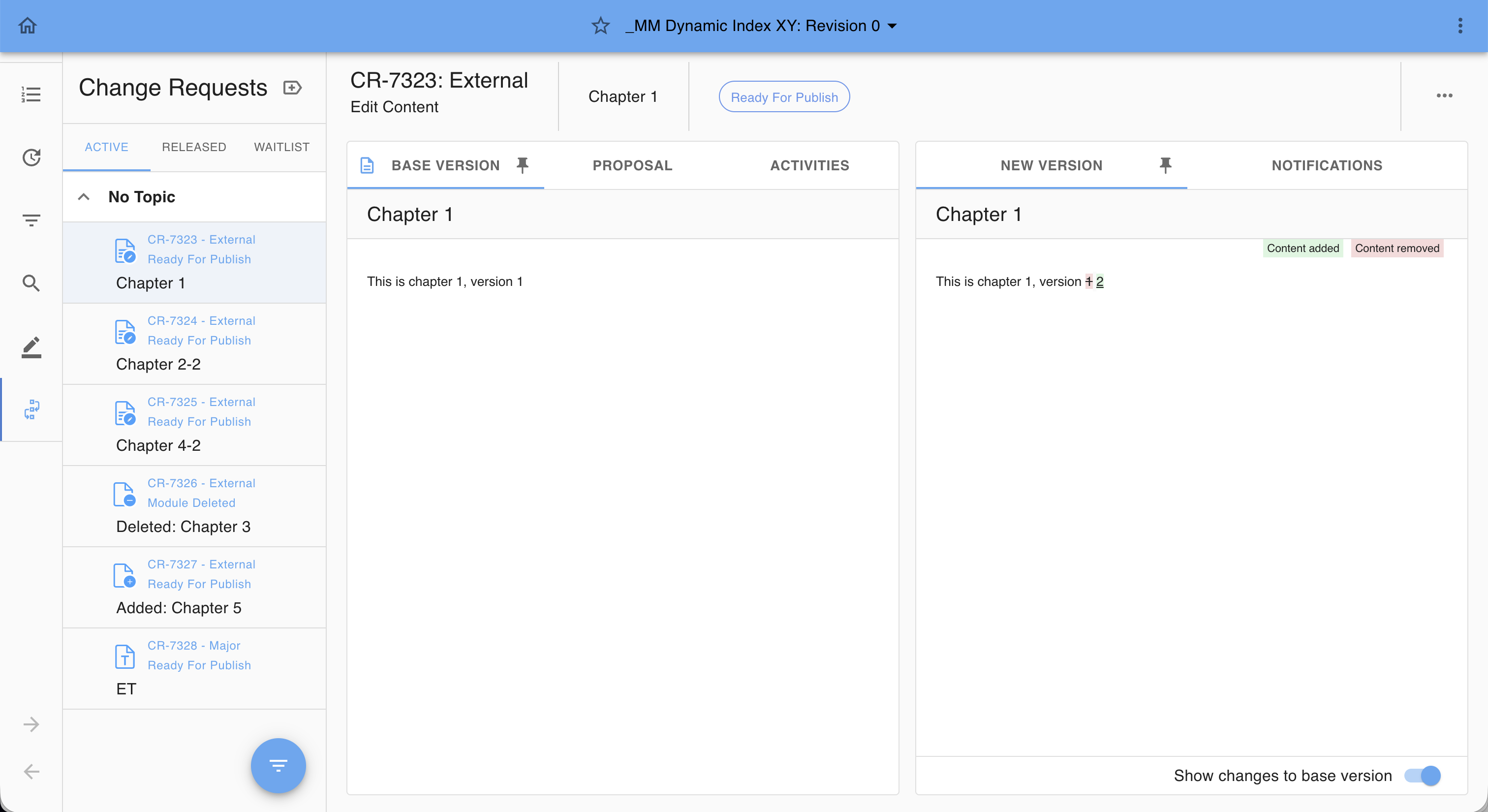 Editors can start implementing a proposed change in the Change Request main screen by selecting a Change Request: