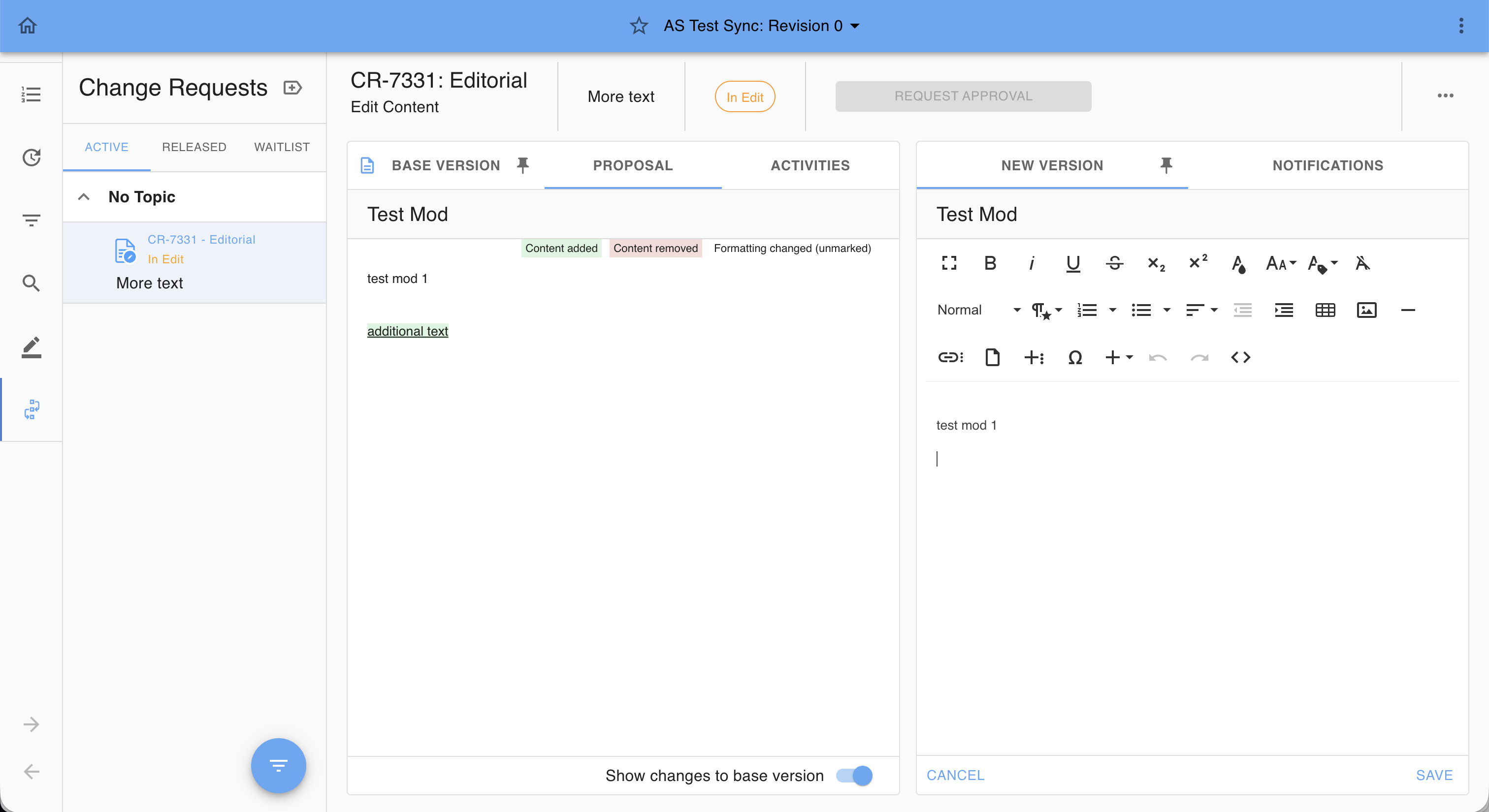 Request Approval – The edited content is ready for review. The Change Request is submitted to designated approvers for validation and sign-off.