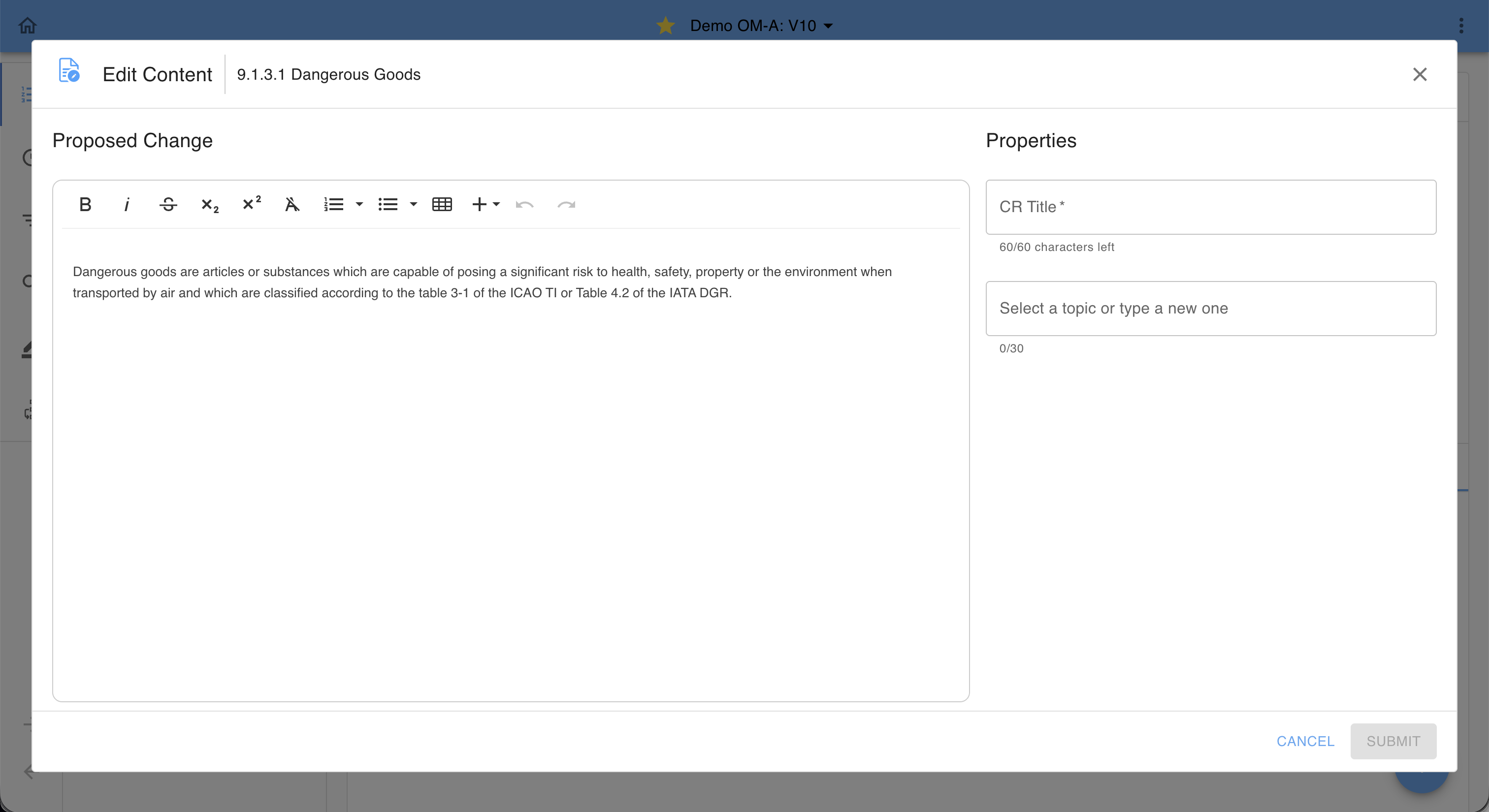Provide a CR title for your proposed change, optionally create or select an existing topic (see dedicated article) and then click SUBMIT (or click CANCEL to start over).