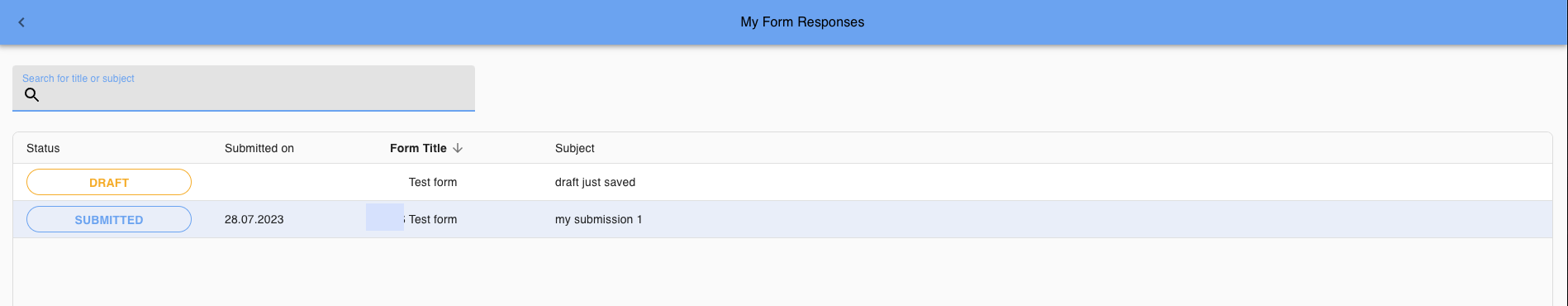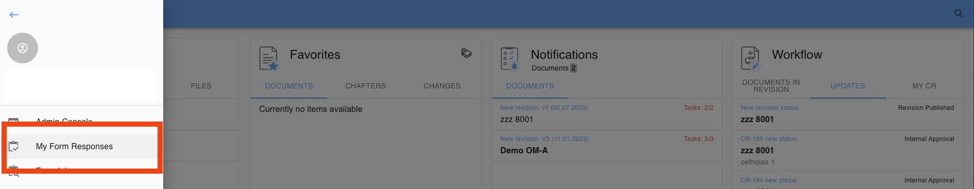 You find your saved (draft) and submitted forms by accessing ‘My Form Responses’ in the settings sidebar: