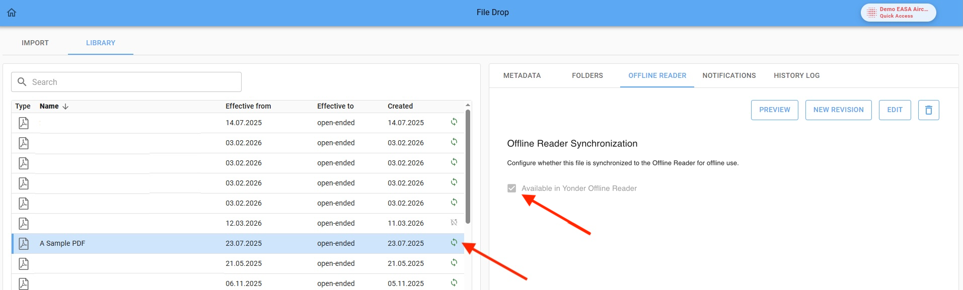 A Sync / No Sync icon in the file list provides a quick visual indication of whether a file is synchronized to the Yonder Offline Reader or not.