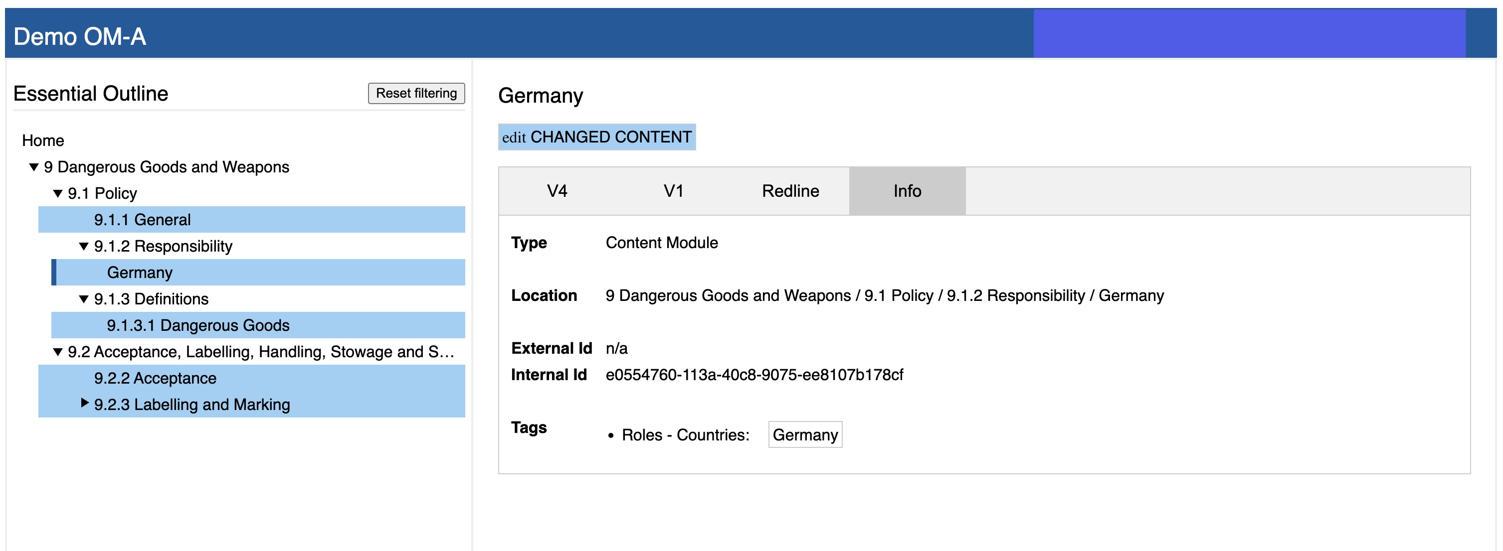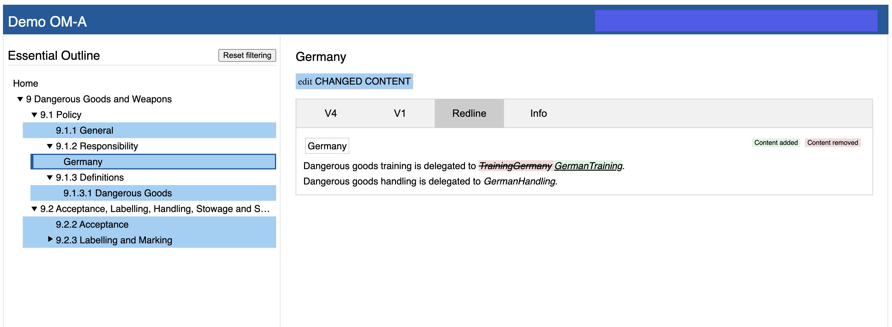 In the left column the outline is displayed and chapters that have changed will be coloured accordingly.