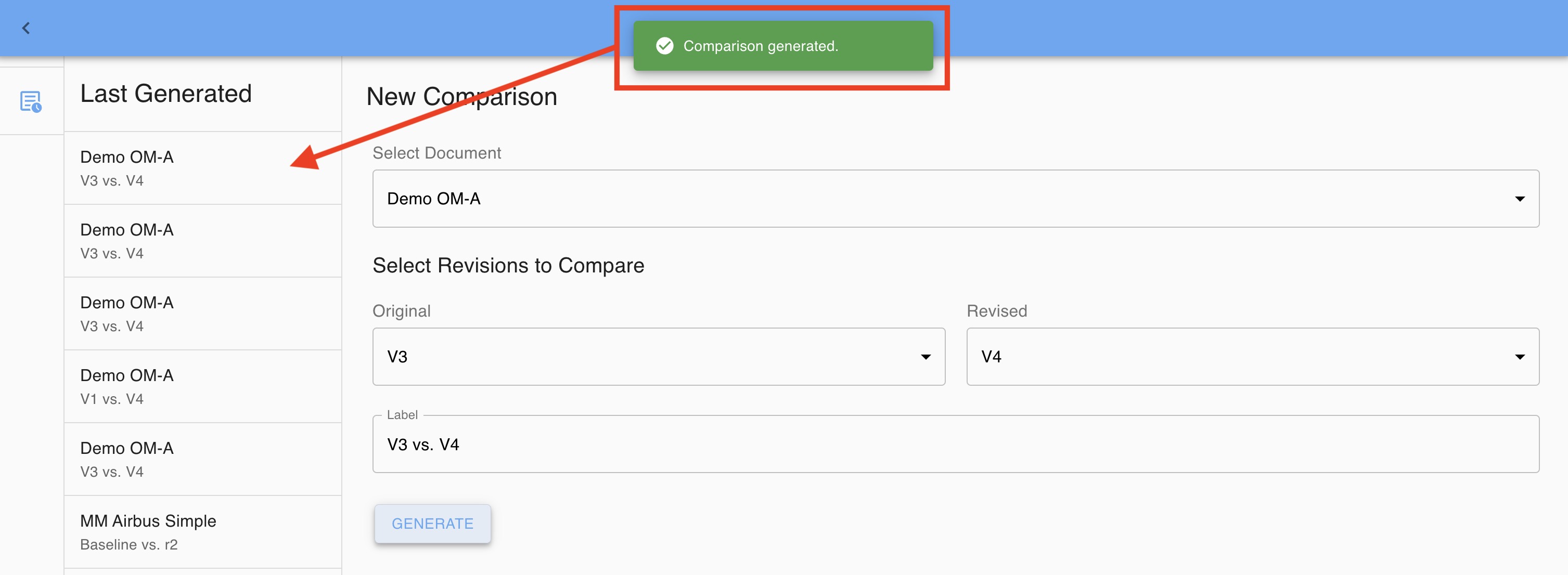 To view the generated comparisons, please select the desired entry from the list of ‘Last Generated’