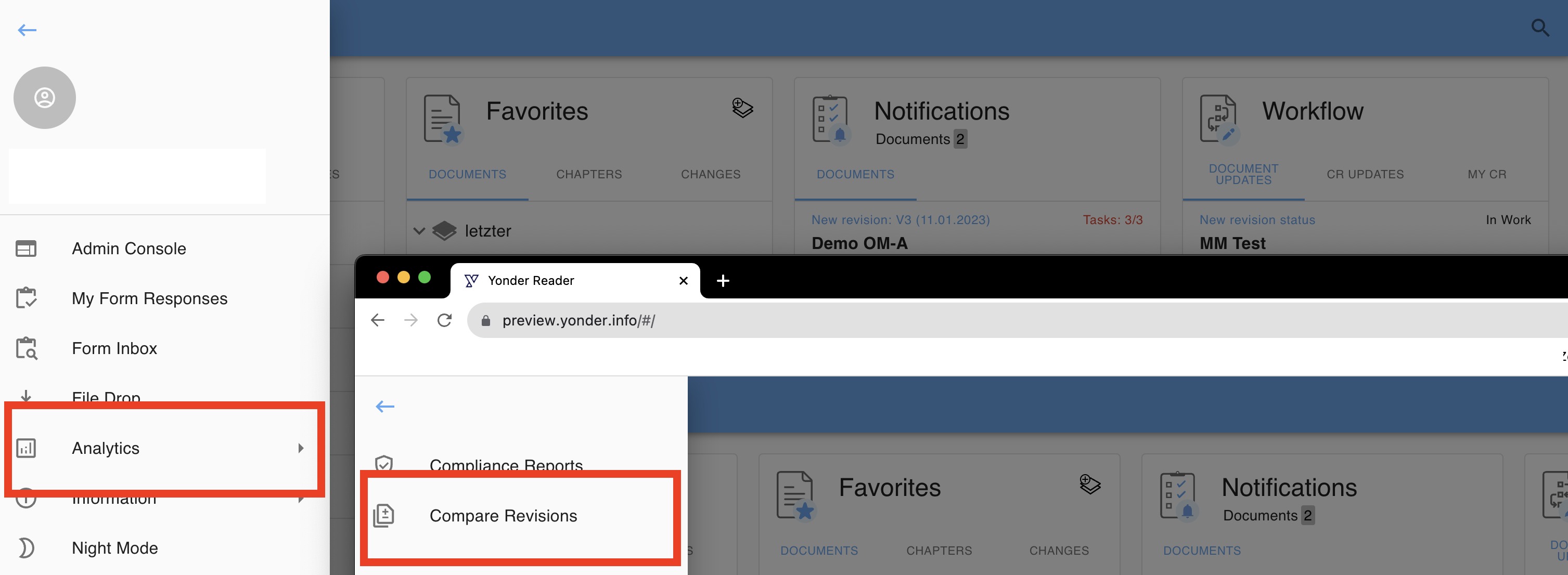Click on the ‘hamburger menu’, select ‘Analytics’ and click on ‘Compare Revisions’.
