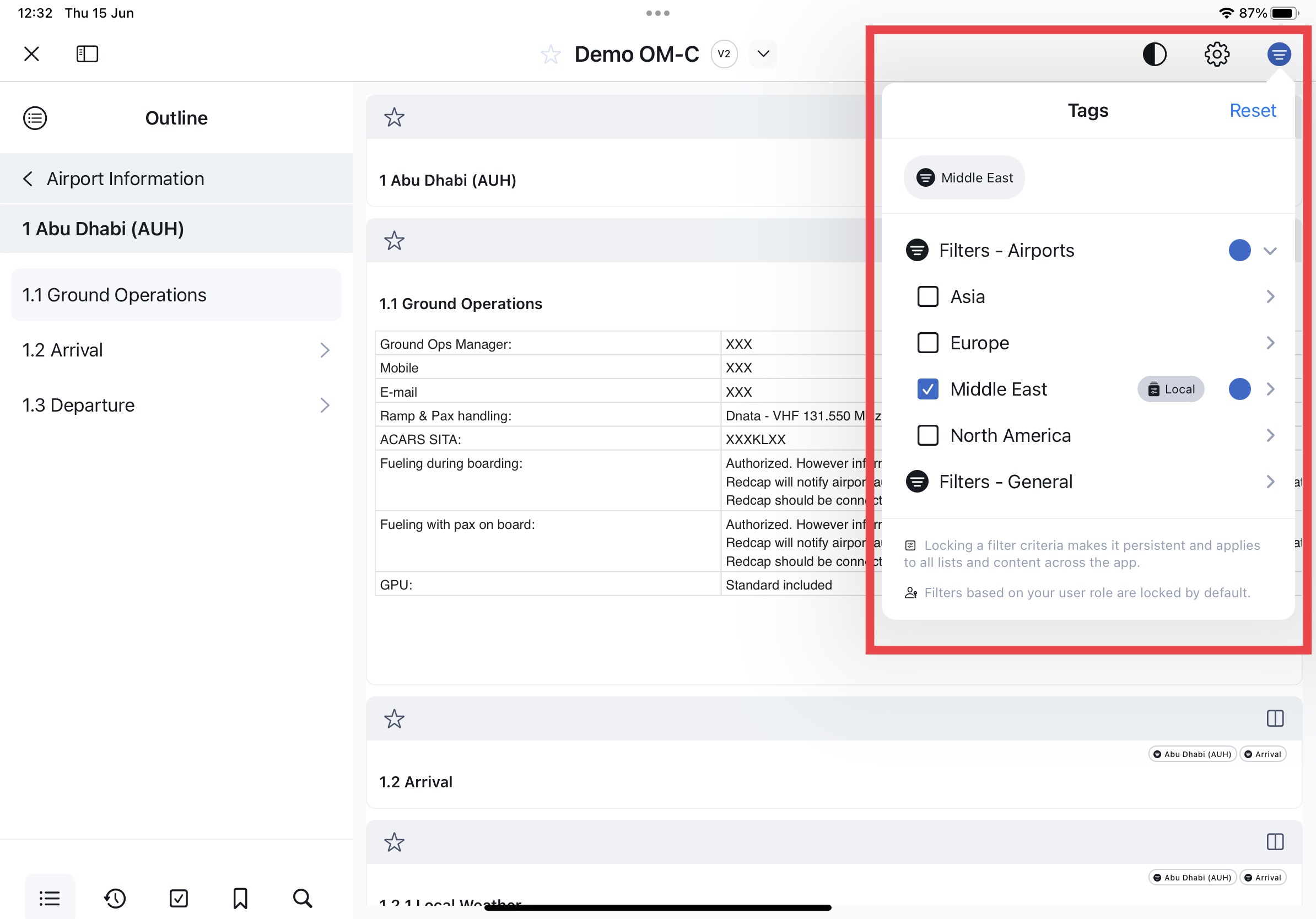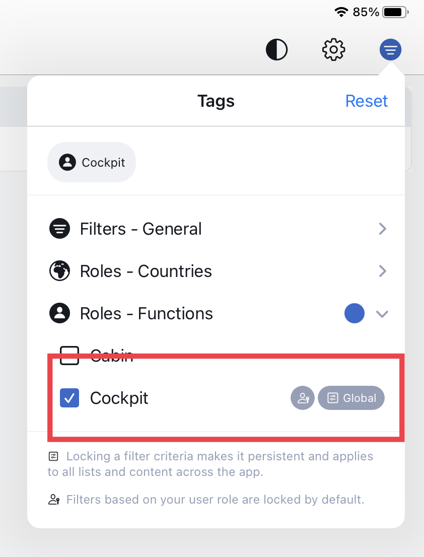 When you manually select tags, they will be displayed prominently at the top of the filter list. Additionally, the filter icon will indicate that a filter is actively being applied. The active filter button will indicate the presence of manually selected tags.