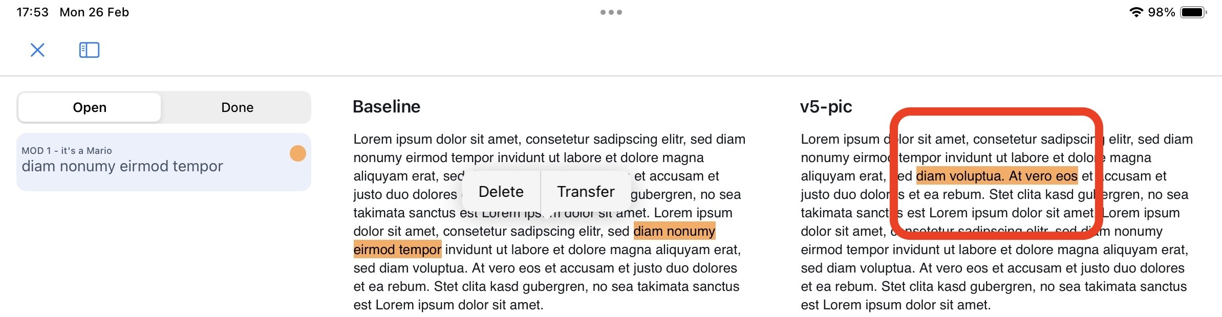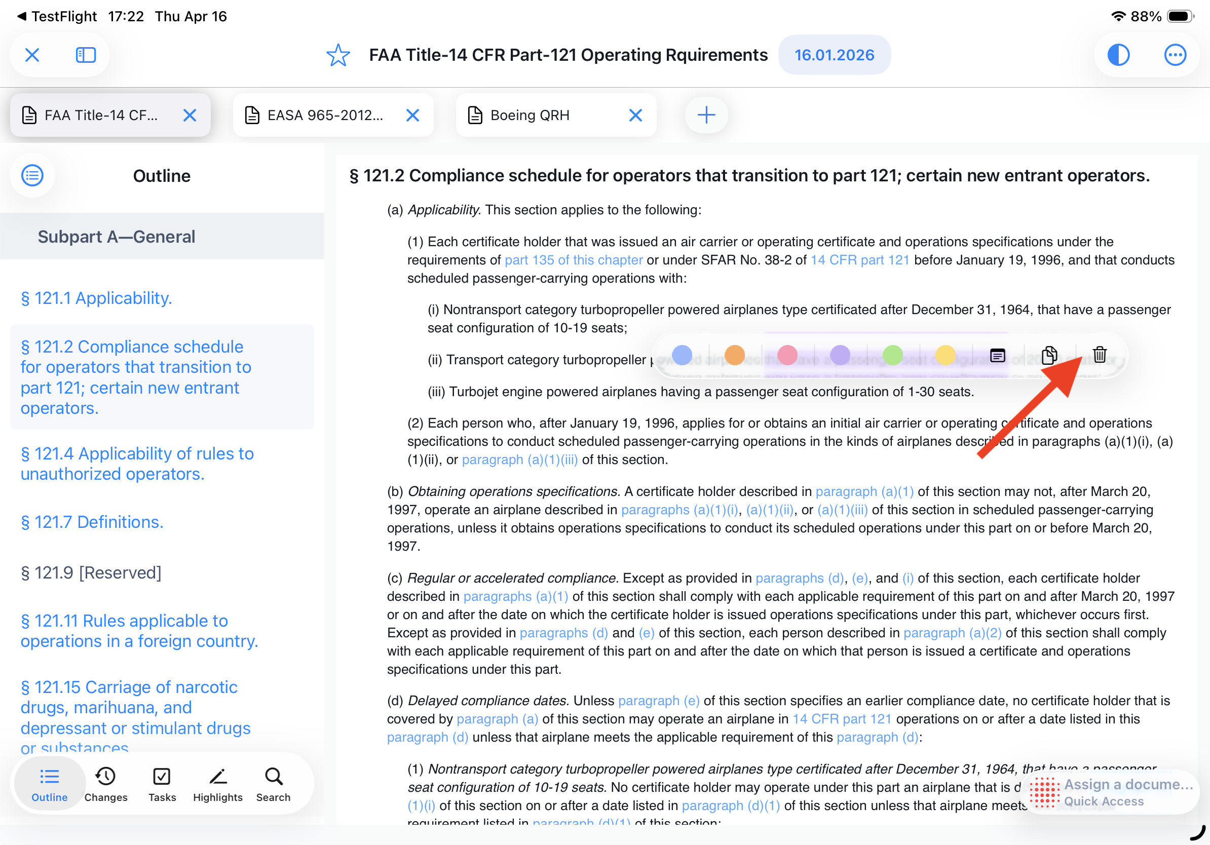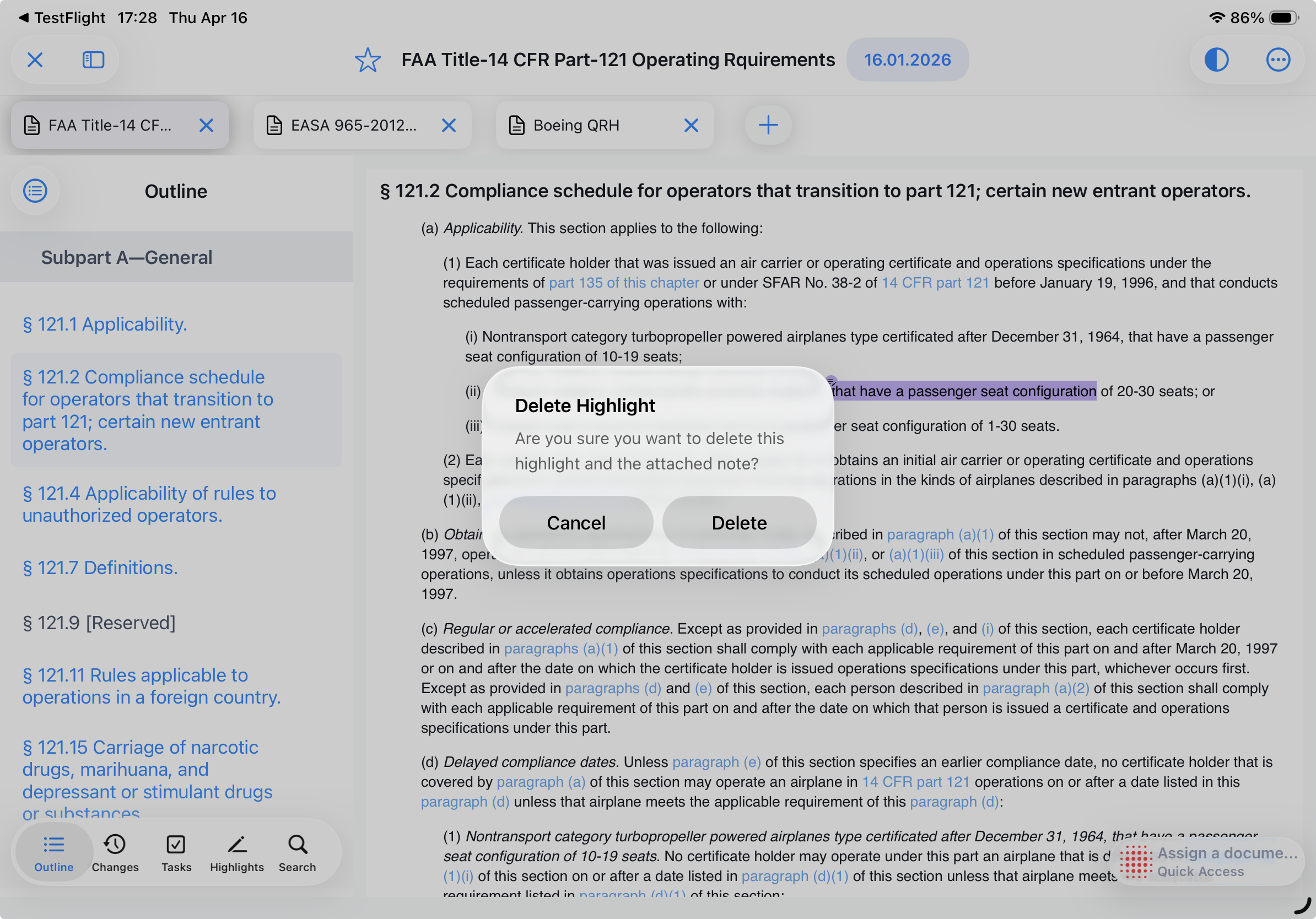 - If you do not like to transfer the highlight select ‘Delete’. The highlight will not be moved to the new revision but still be visible in the old revision.