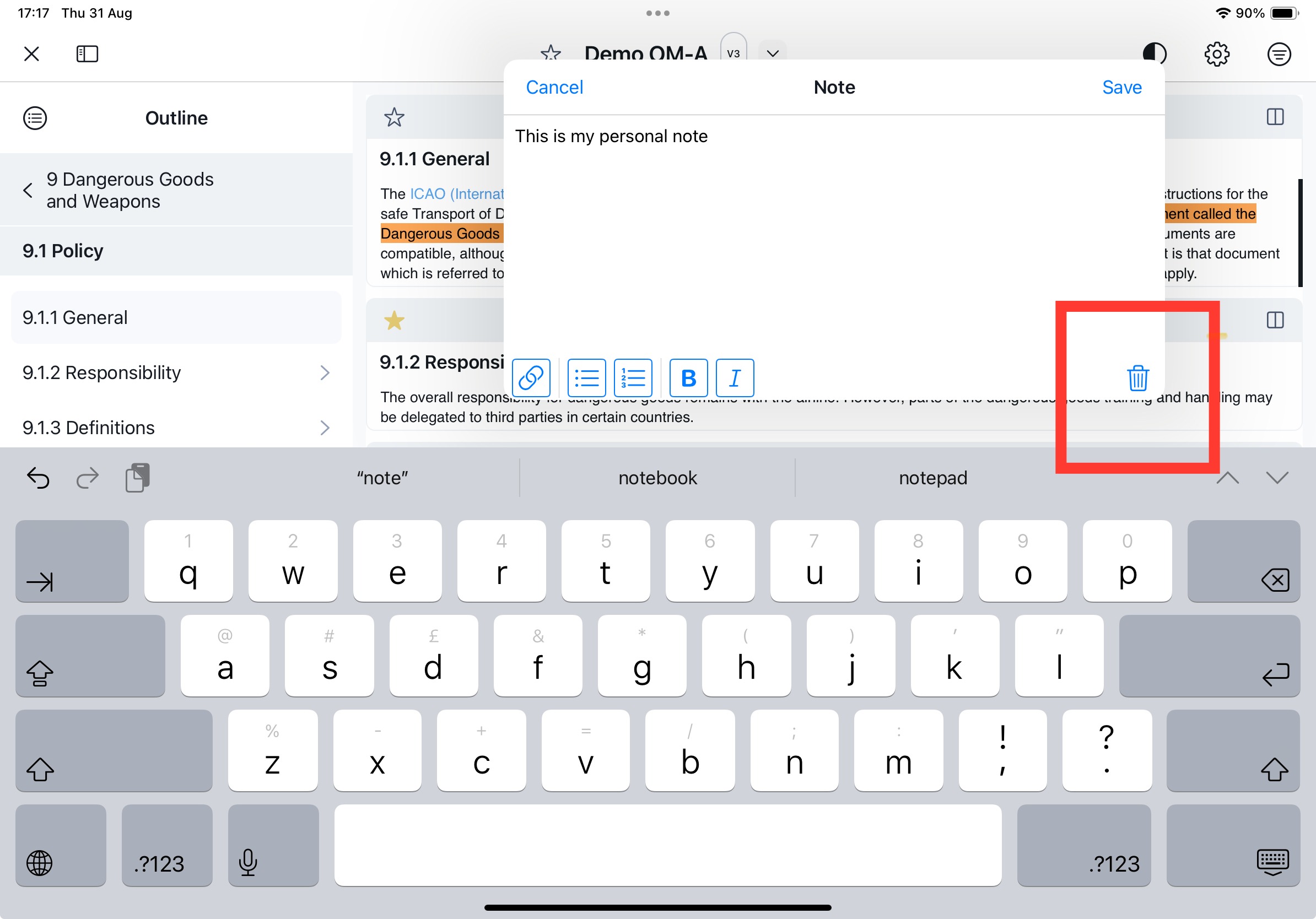 - Trash-bin will delete the note - the highlight remains set