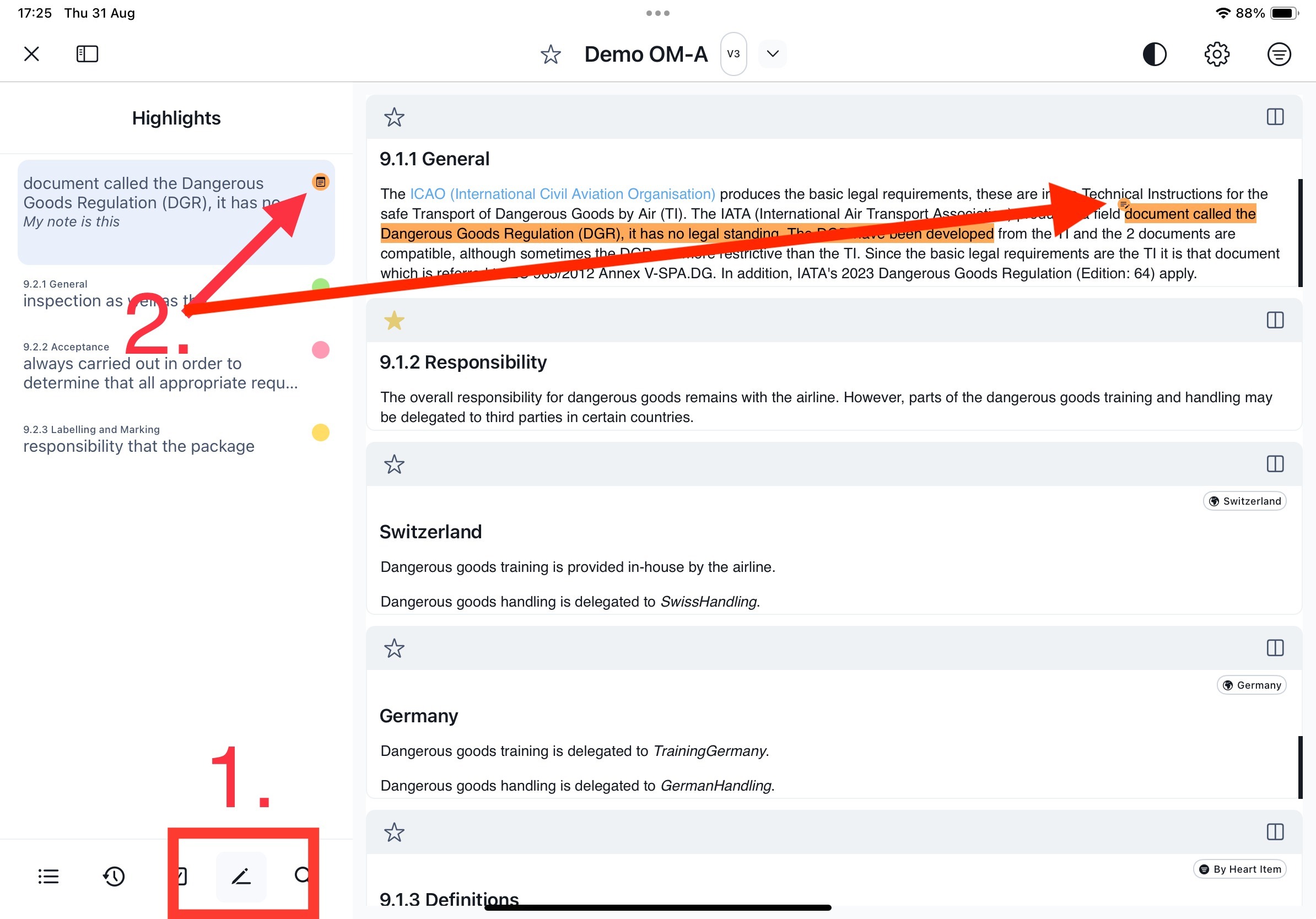 - Highlights that contain notes are marked with a note symbol in the highlight bubble (2).