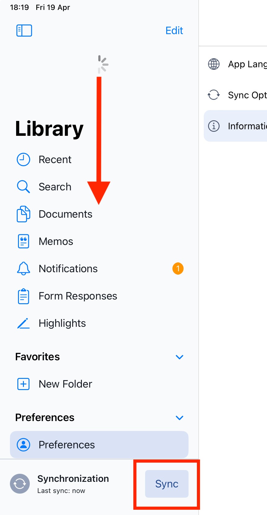 If iOS interrupts this process and the background sync fails, a badge informs the user. Start a manual sync in the foreground to continue.