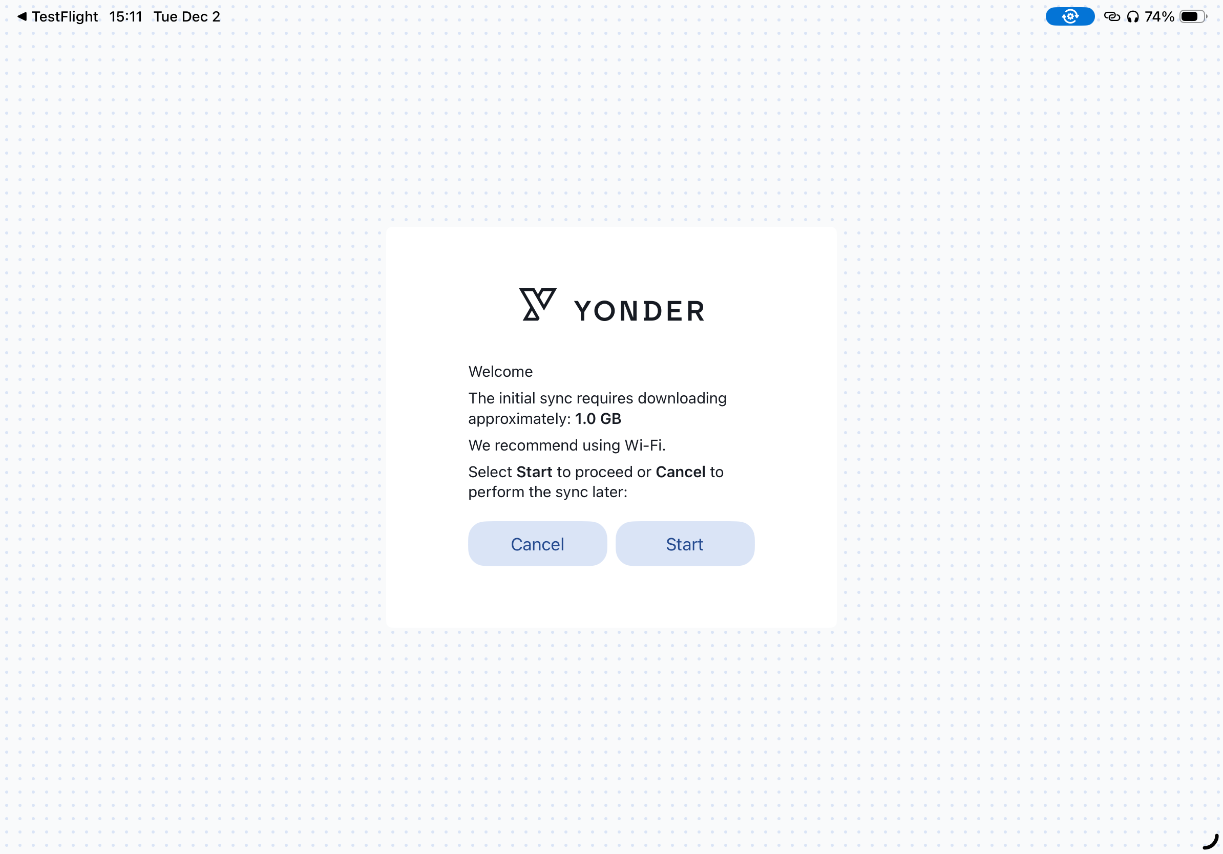 The initial syncronization will start when installing Yonder. An automatic synchronization process will commence, downloading all the authorized data accessible specific to the user.