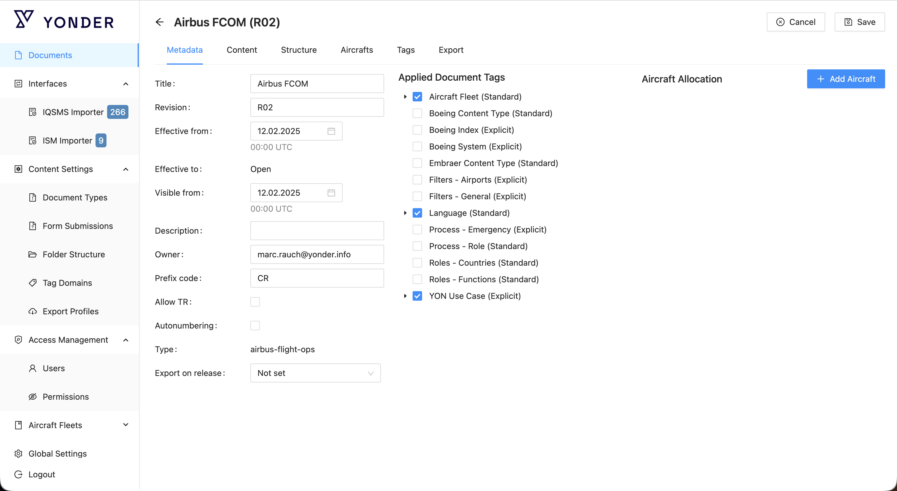 | Aircraft Allocation | Select an export formatfor a document version to enable automatic export upon release.