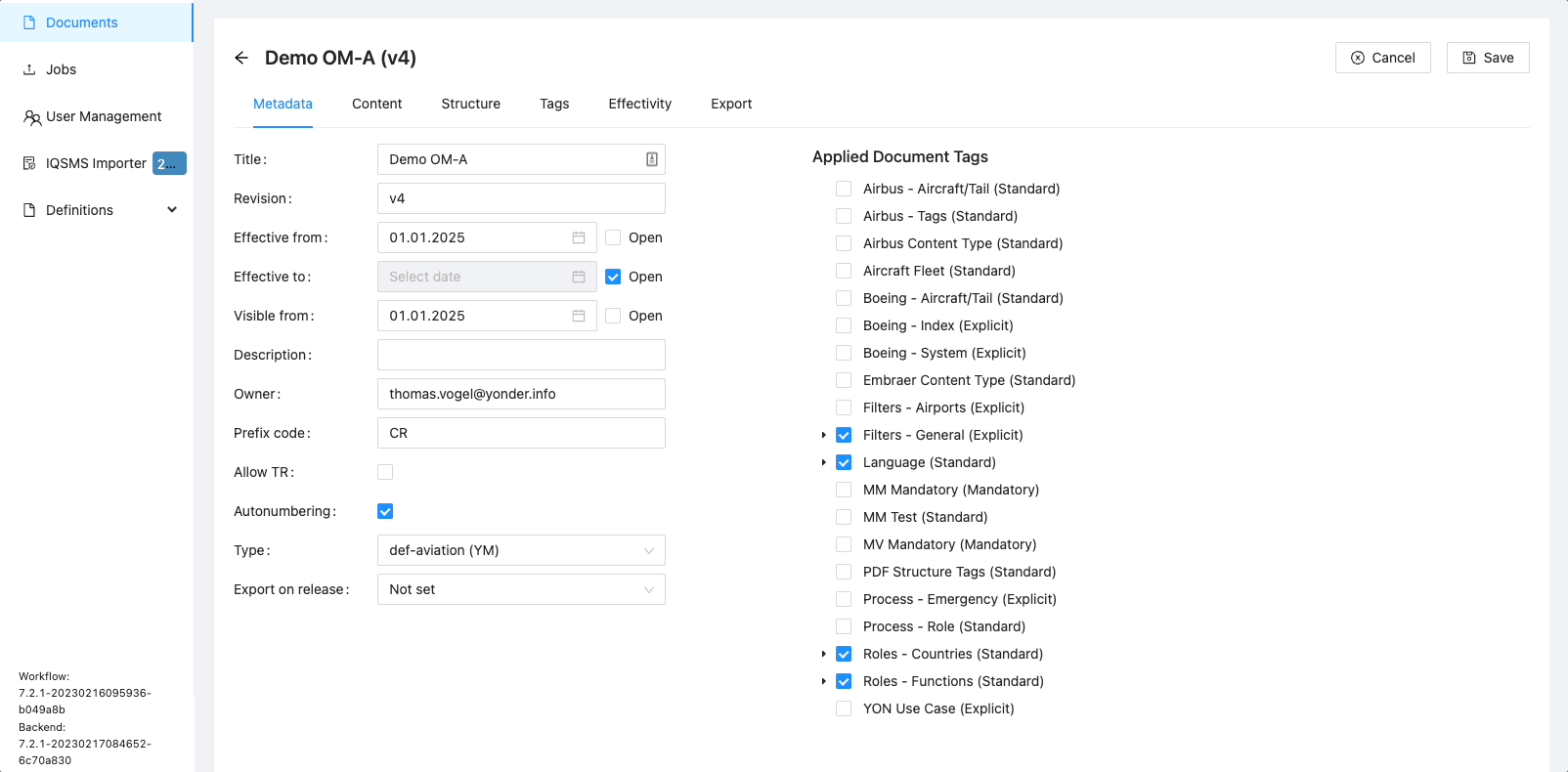 The “Metadata” tab allows selected users to define various properties that apply to the document as a whole.