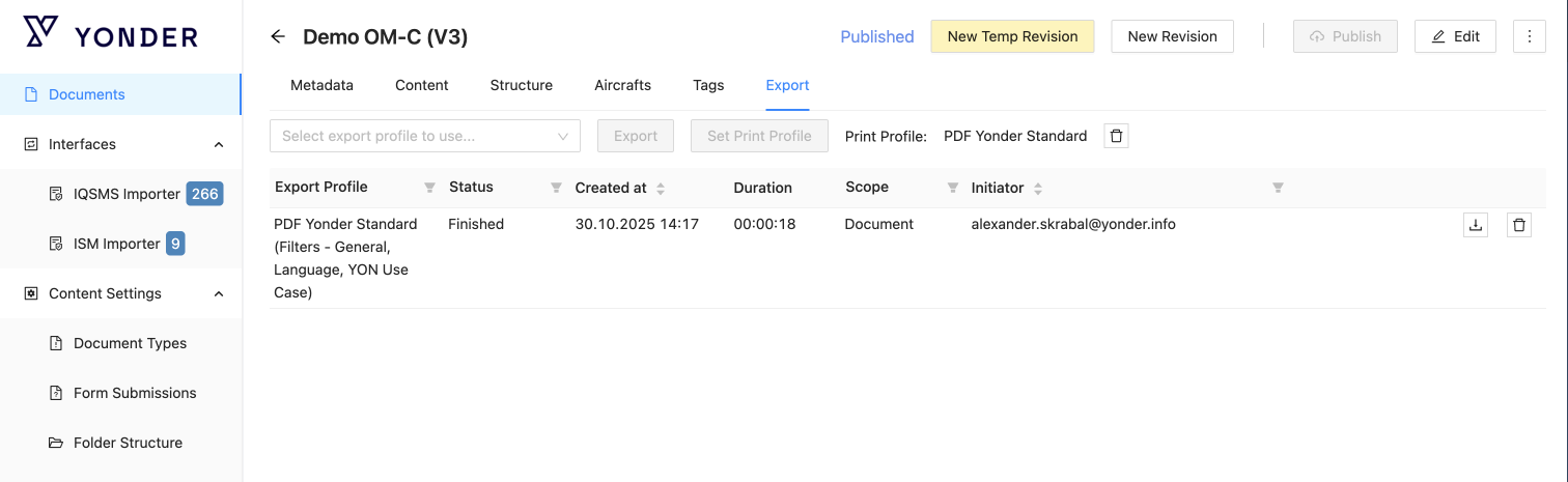 Select the document revision in the admin console and select the desired export profile under ‘Export on release’: