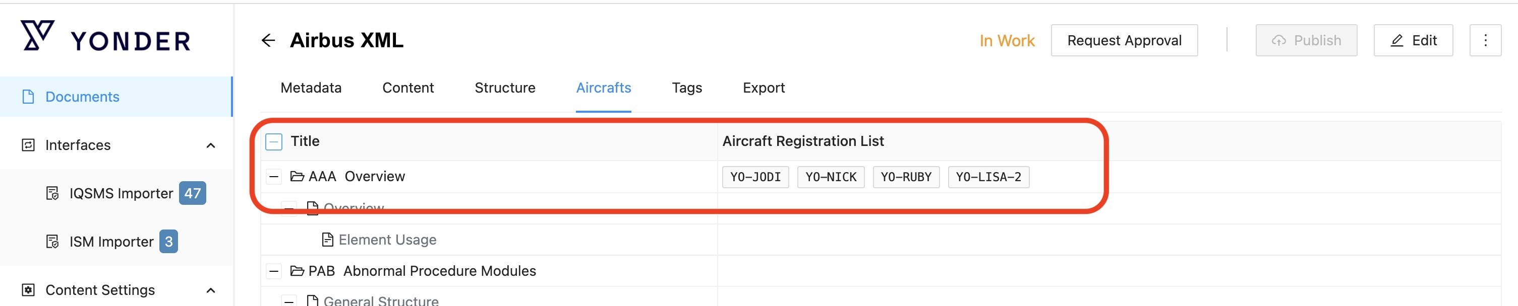 The Aircrafts tab is available in the Admin Console for OEM documents. It allows authors to review and manage aircraft assignments at the module level.