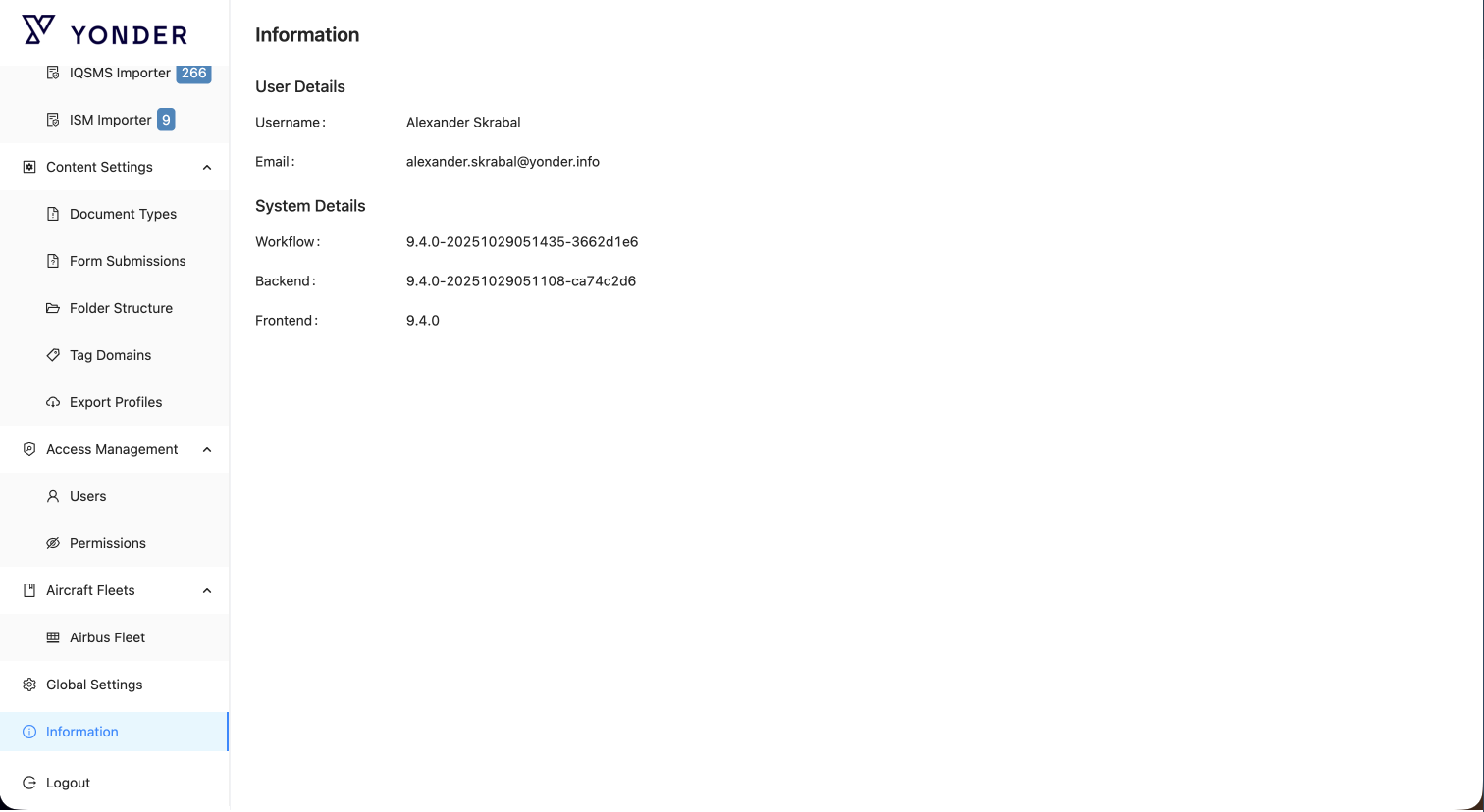 The Information section displays both User Details and System Details relevant to the current Yonder environment.