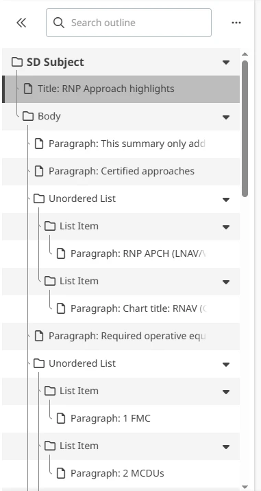 - Reordering: In some cases, the outline sidebar allows users to drag and drop elements to reorder them. This functionality is constrained by predefined rules (like those from Airbus), ensuring that the structure remains compliant.