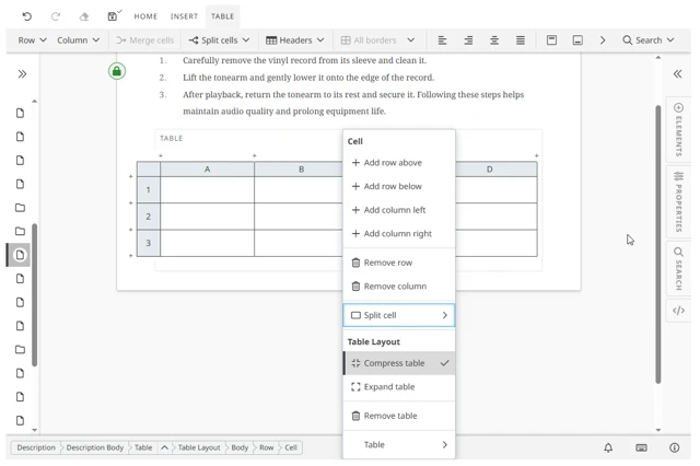 - Insert sections, paragraphs, tables, images, and other elements