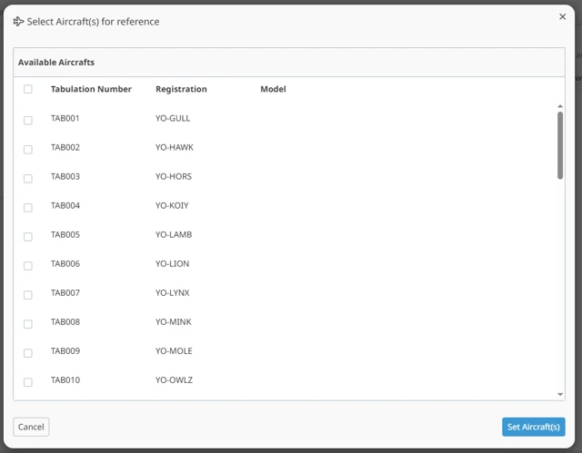 - Select applicable aircraft