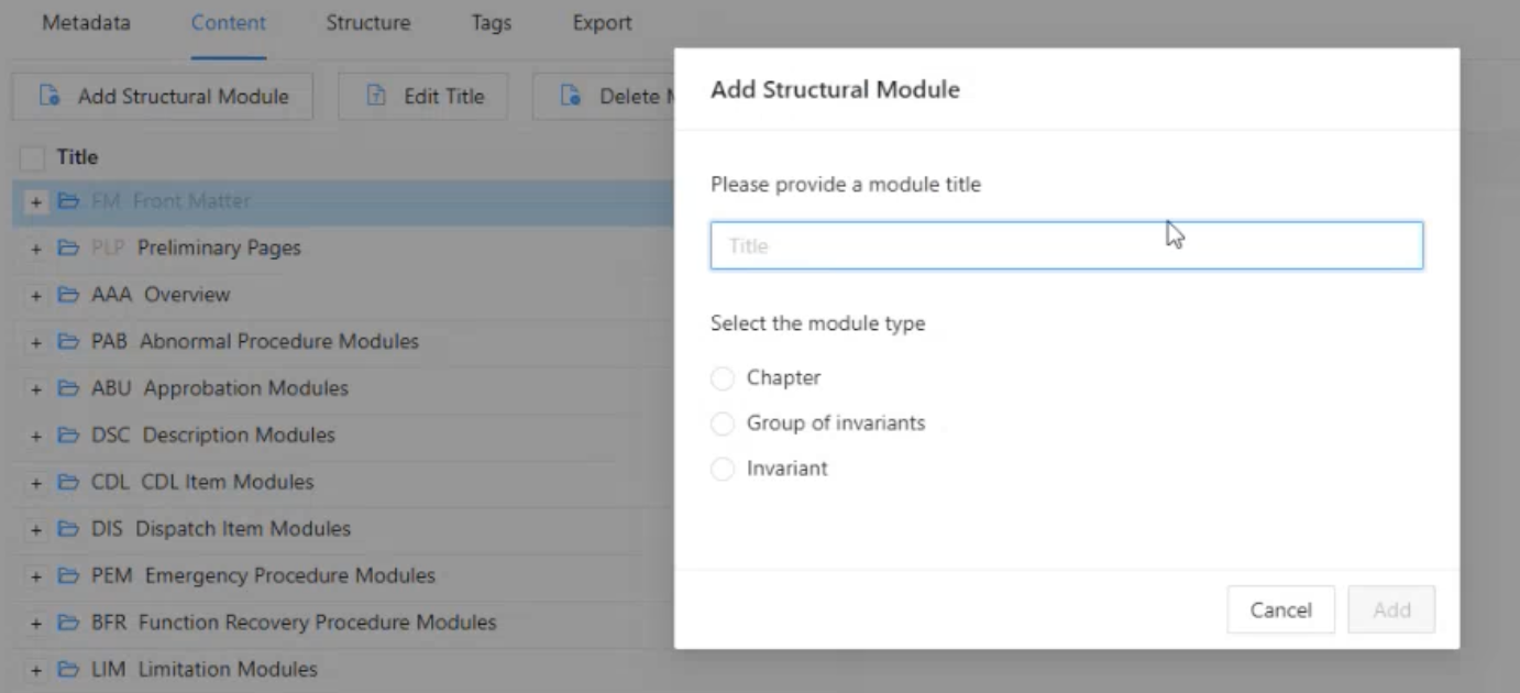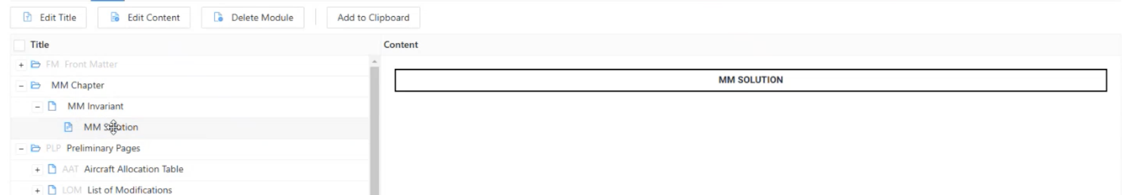 Note: The document outline is generated dynamically according to a set of rules established by Airbus. These rules determine the structure and content of the document. For example, when adding a Structural Module to an Invariant, the Airbus rule set, defined by a Document Type Definition (DTD), limits the available options. In this case, only one valid solution can be added, as the DTD enforces these constraints