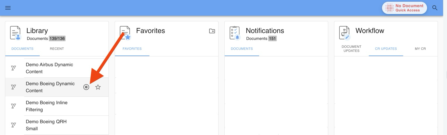 The Quick Access feature allows users to define a Quick Access Document for fast access to frequently used or mission-critical content.